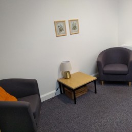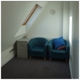 The Taylor Room is a small meeting room and can be found on the first floor of the centre. It has a sloping ceiling and is full of natural light and has 2 comfy armchairs, a desk and an office chair.
