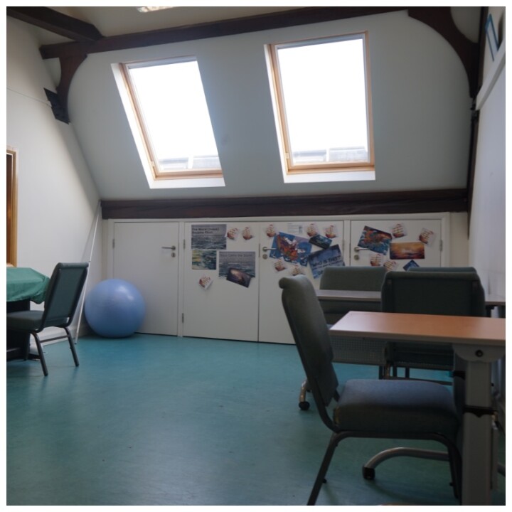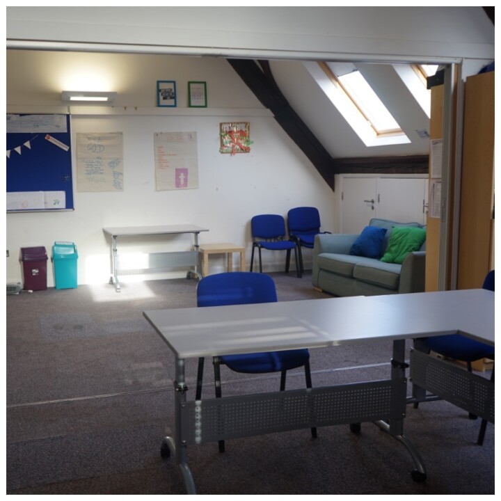 The Smith and Salway Rooms are lovely small rooms with arm chairs and a coffee table, ideal for counselling or one-to-one meetings, as well as a quiet place for office work or zoom meetings. The Smith Room also has a large desk and office chair, the Salway Room also has a long sofa. Both rooms have a large Velux window giving lots of natural light. These two rooms are only accessible via steps.
