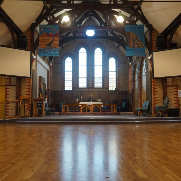 With its high ceiling and stained-glass windows, the auditorium is a versatile space that is perfect for large events. The floor is polished wood, sprung for dancing, and there are enough chairs available to fill it for a concert. The carpeted Chancel area is not to be used by hirers, but the steps at its edge may be used for speaking from.