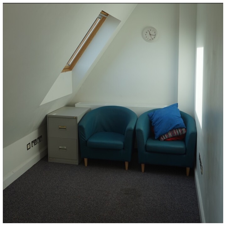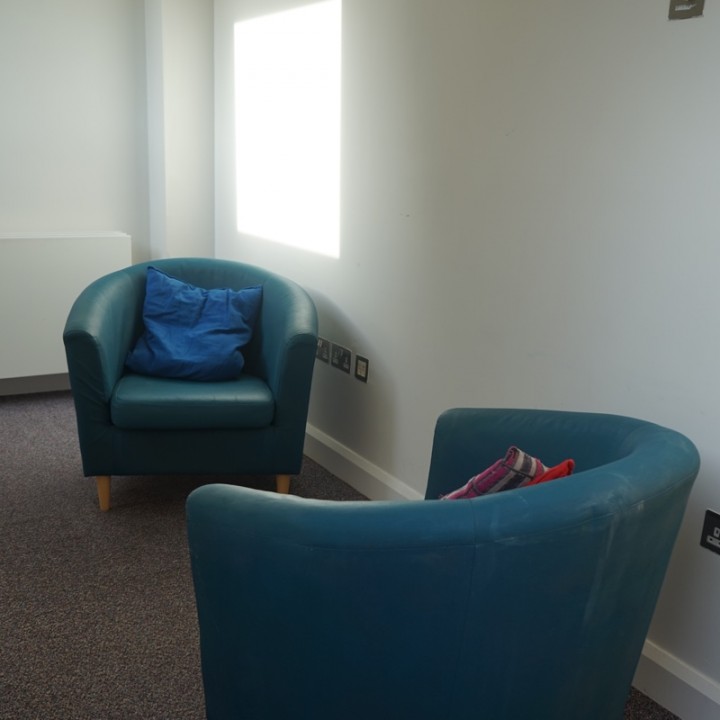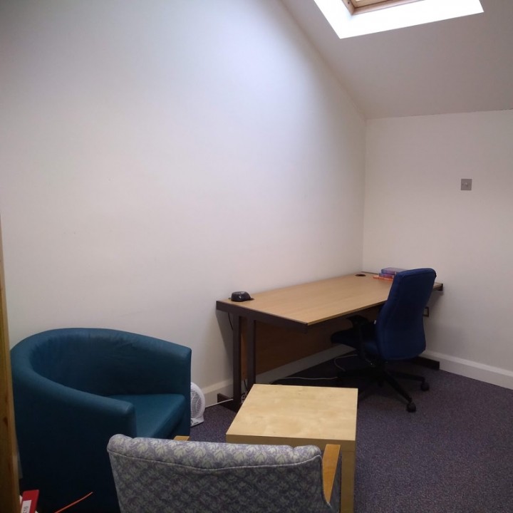 The Taylor Room is a small meeting room and can be found on the first floor of the centre. It has a sloping ceiling and is full of natural light and has 2 comfy armchairs, a small desk and an office chair.